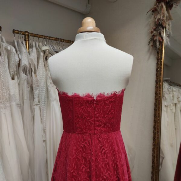 Forme : Robe longue bustier en dentelle rouge doublée - forme trapèze - Haut bustier, cintrée à la taille - fermeture par glissière