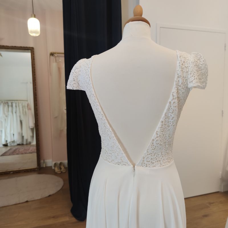Apolline – Atelier de confection – Robe en mousseline légère et de qualité – décolleté élégant en dentelle forme cache coeur – manchons – dos en V profond – La dentelle est fine et délicate – Robe sans traine pour plus de confort et de légèreté.