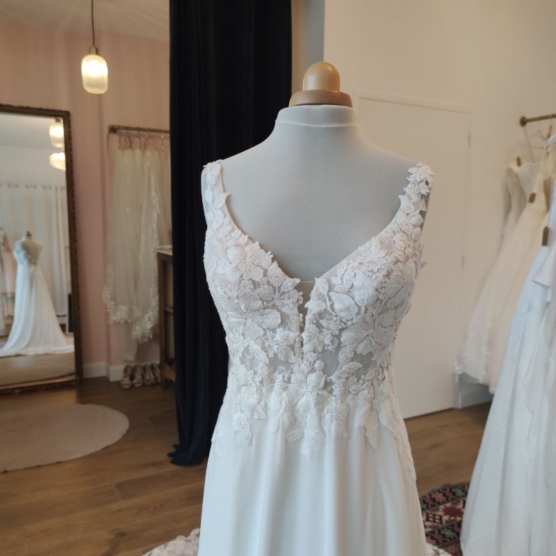 Enza – Robe de mariée romantique en mousseline ornée d’appliques de dentelle sans sequins – le haut offre un joli décolleté sans être trop ouvert, les bretelles sont fines et la dentelle descend en cascade sur la taille (pas de ceinture franche )- dos en V profond avec effet tatouage de la dentelle – La traine est majestueuse