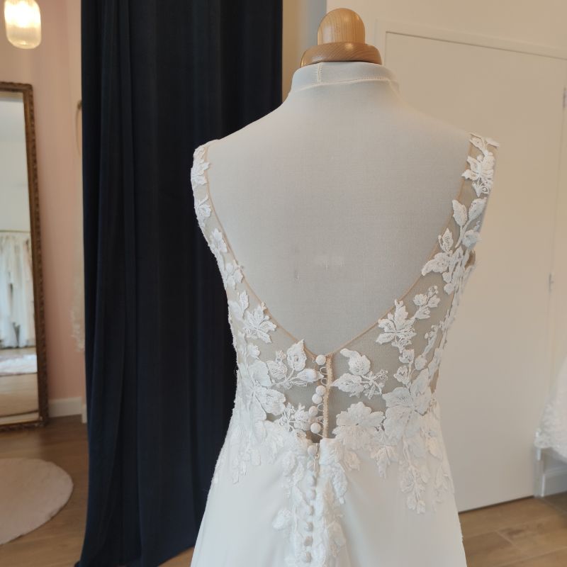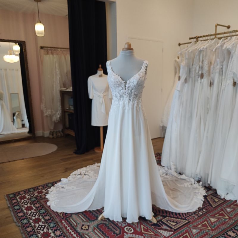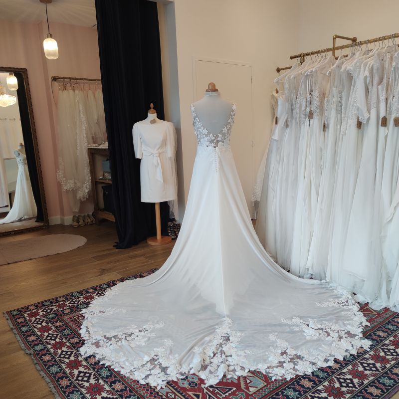 Mon petit mot : Cette robe a de beaux atouts : la silhouette est seyante et flatteuse, elle est confortable à porter et la traine reste légère (mousseline). C’est un modèle très tendance !