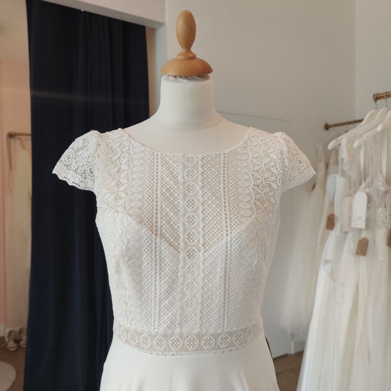 Elma – Robe de mariée bohème chic confectionnée dans un crepe de grande qualité doux et fluide. Le haut de la robe est en dentelle/broderie géométriques fines avec un col rond haut.Le dos en V est très plongeant.