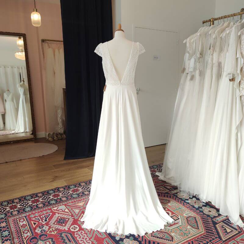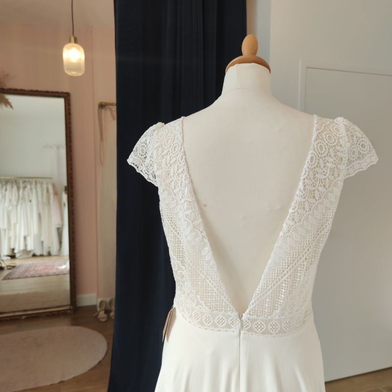 Mon petit mot : Je suis fan de ce modèle car la dentelle offre un bel effet tatouage sur la peau. La robe convient également parfaitement aux poitrines menues et aux femmes qui préfèrent un dos plongeant à un décolleté plongeant ! Les tissus sont d’une très belle qualité.