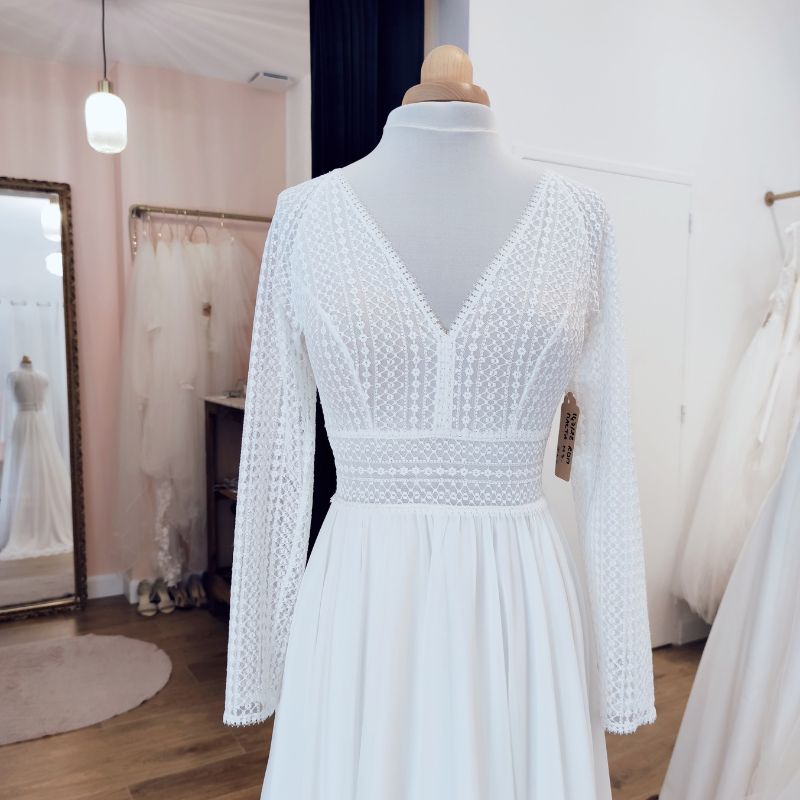 Malta – Robe de mariée de style bohème avec une mousseline fluide et légère – Avec son dos fermé et ses manches longues, elle est parfaite pour les mariages de mi-saison ou d’hiver.