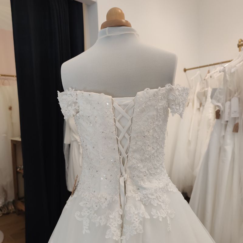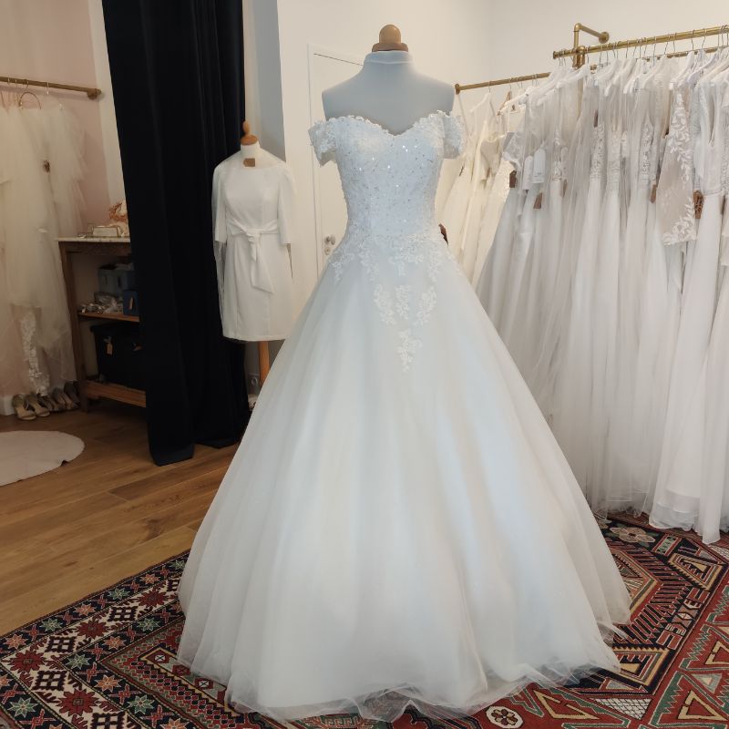 MILA – robe de style princesse avec son tulle pailleté volumineux, son bustier demi-coeur et ses manches tombantes (ou col bateau). La silhouette est bien galbée grâce au laçage. Sans traine